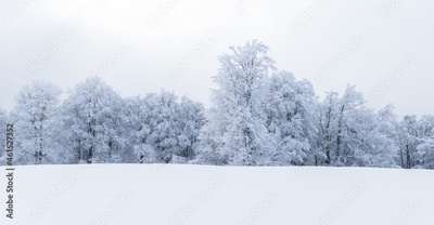 Minimalistic winter landscape in cloudy weather with snowy trees. Carpathian mountains, Landscape photography