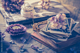 Memories - old family photo album with necklace, old books and dried flowers