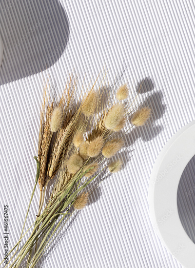 Fluffy dry lagurus ovatus or hares-tail grass with dried wheat on the white background. Modern geometric composition with autumn plants