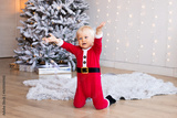 Happy little boy in Santa costume near tree decorated for Christmas. Merry Christmas and Happy New Year.