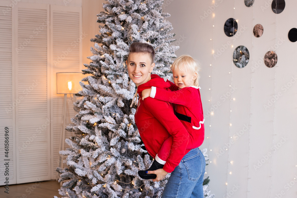 Cute little boy and mother near Christmas tree. Christmas, holidays and childhood concept.