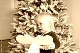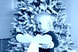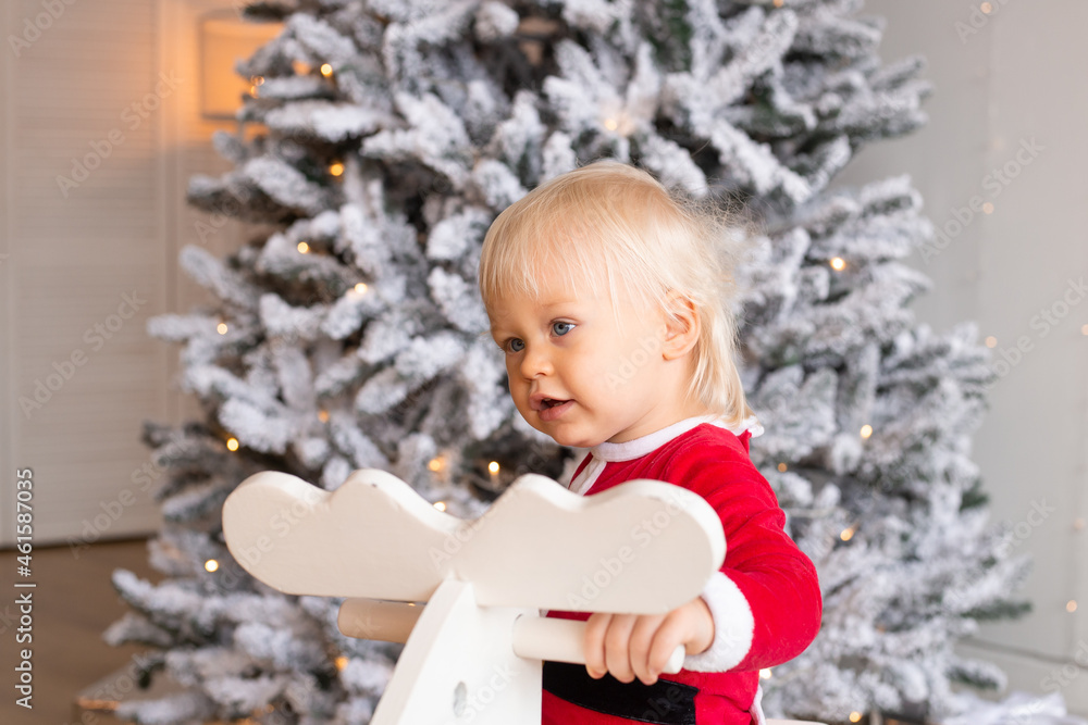 Little smiling baby sitting on toy horse near Christmas tree at festive decorated home