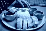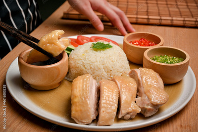 Female used chopsticks for grab some chicken dipping in sauce. Hainanese chicken rice