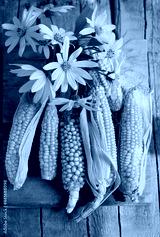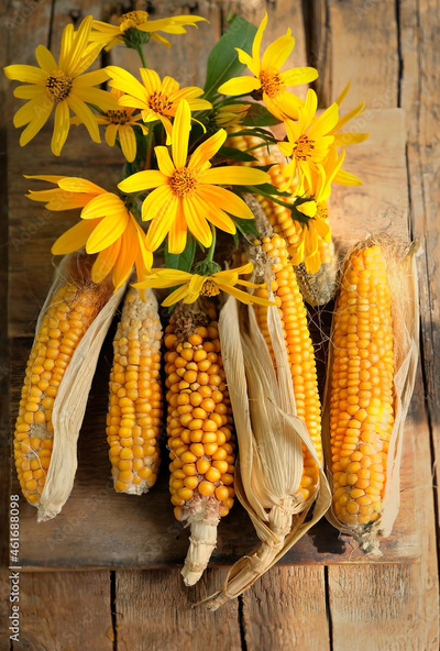 ripe corn cobs and yellow flowers on rustic wooden background. harvest season. autumn time concept. top view