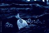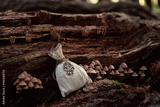magic witch's bag with pentagram amulet and mushrooms on natural dark wood background. esoteric concept. Black magic, witchcraft occult wiccan ritual.