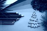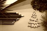 Simple wooden tree and many green color pencils lay on the green color gradation paper background, branches of different fir trees, craft and diy concept