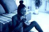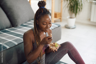Happy black female athlete eats healthy food while exercising at home.