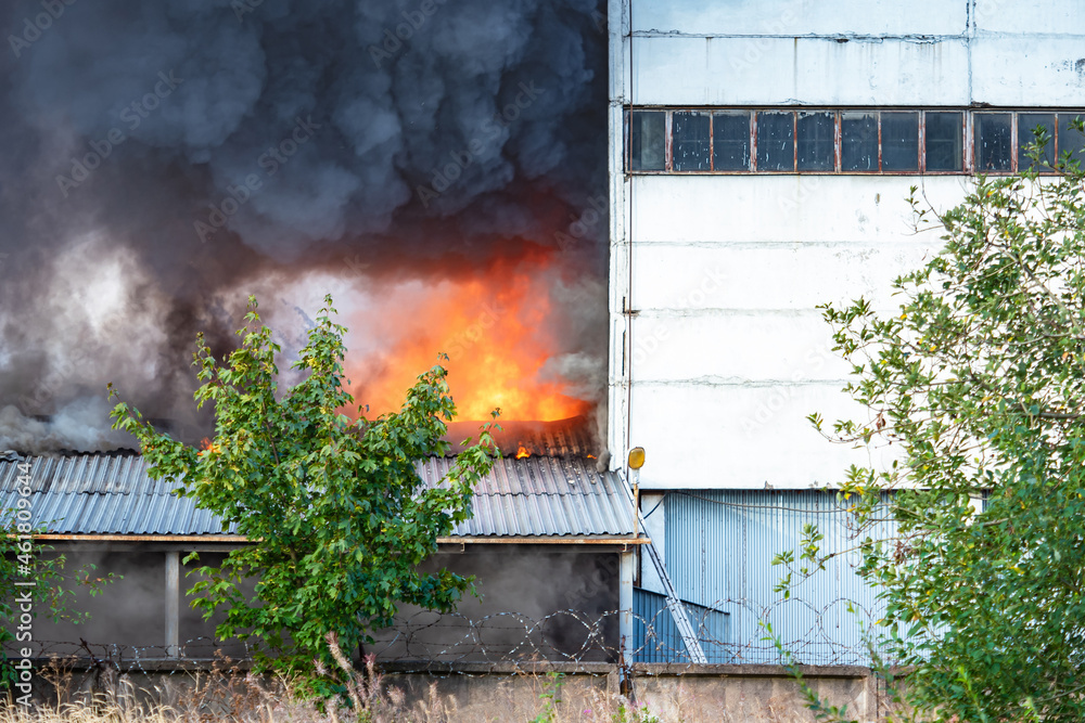 Smoke and flames near building. Fragment building of burning factory. Concept of emergency at enterprise. Fire on plant. Puffs of black smoke from fire. Fire near industrial building