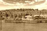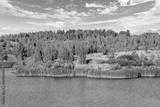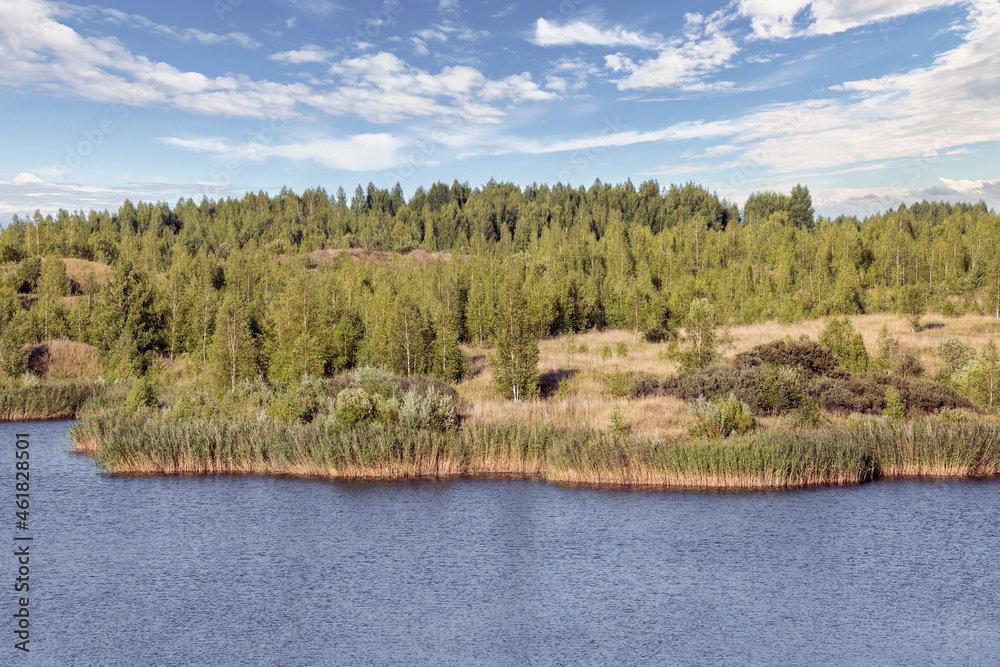 A lake with a plane surface and reflections against the blue sky and white clouds. Originated from an old quarry flooded, groups of islands overgrown with reeds.