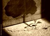 Start, Think Big, Recovery and Challenge in Life or Business Concept.Economic Crisis Symbol.New Green Sprout Plant Growth in Cracked Concrete and Shading a Big Tree Shadow on the Concrete Wall