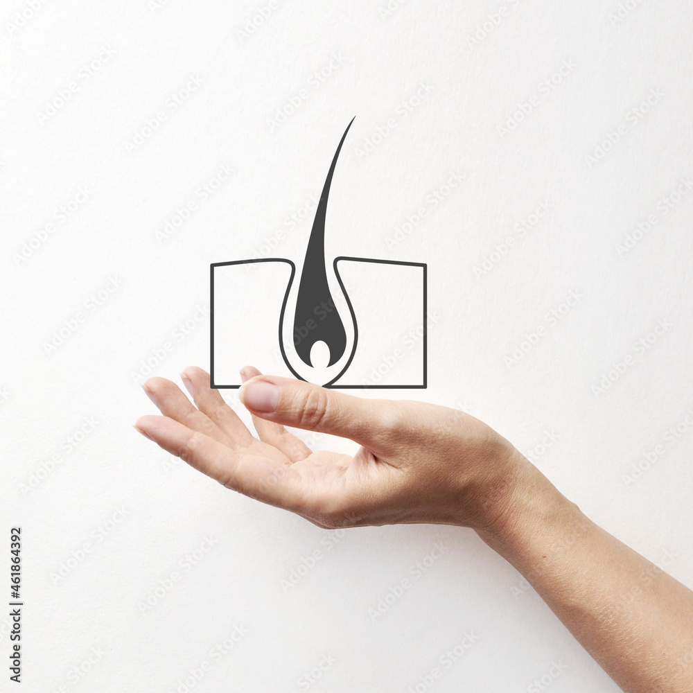 The silhouette of a human hair in human hands. A symbol of the treatment and prevention of diseases of the hair and scalp