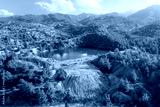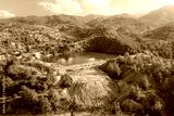 Abandoned pyrite mine in Xyliatos, Cyprus. Lake in open mine pit and waste heaps over mountains landscape
