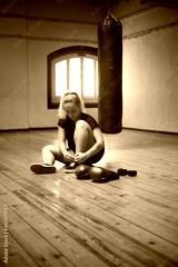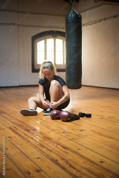 Woman getting ready for training. Young woman in black sport clothes sitting on floor tying laces. Sport, healthy lifestyle, boxing concept