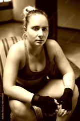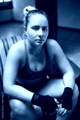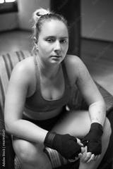Thoughtful young sportswoman sitting in chair. Woman in black sport clothes getting ready for training, looking at camera. Sport, healthy lifestyle, boxing concept