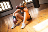 Tired young woman sporty after training. Woman in modern sport clothes sitting on floor, wiping forehead. Sport, healthy lifestyle, boxing concept