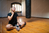 Young woman checking pulse. Woman in black sport clothes sitting on floor, touching neck with fingers, counting. Sport, healthy lifestyle, boxing concept