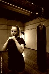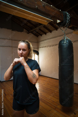 Portrait of young woman in combative position. Woman in black sport clothes showing fists at camera. Sport, healthy lifestyle, boxing concept