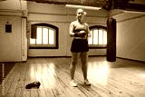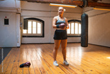Young sportswoman in boxing glove. Attractive woman in sport clothes standing at gym, looking sideways. Sport, healthy lifestyle, boxing concept