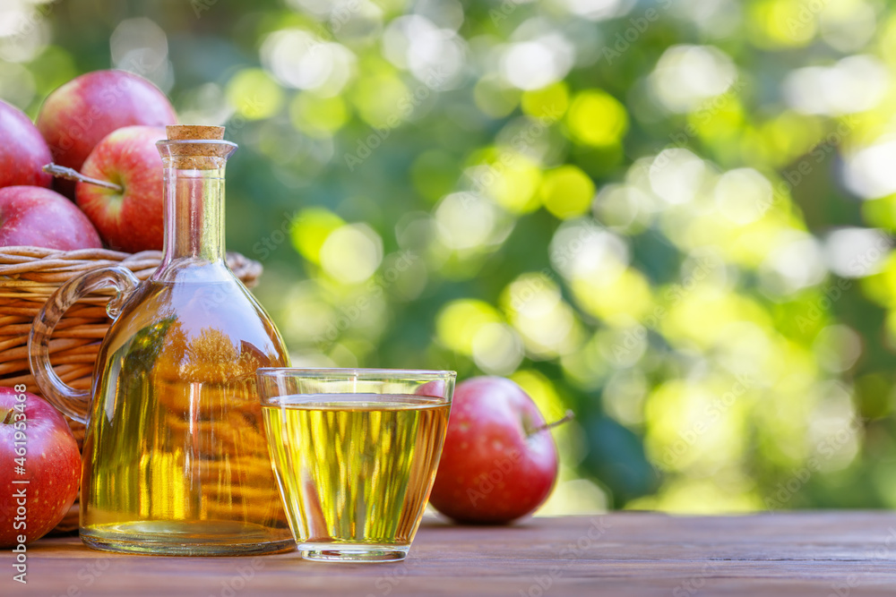 apple cider or juice in glass and bottle outdoors