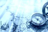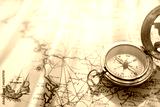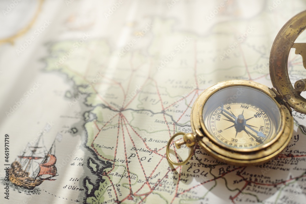 Retro style antique golden compass (sundial) and old nautical chart close-up. Vintage still life. Sailing accessories. Wanderlust, travel and navigation theme. Graphic resources, copy space