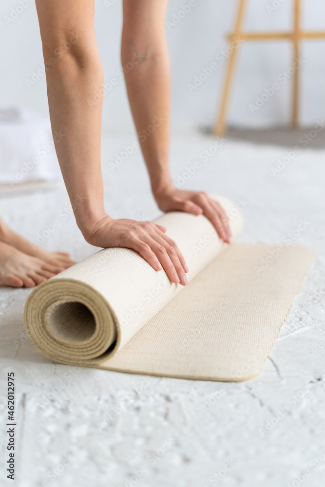 Close-up of female hands rolling out beige yoga mat. Yoga Home.