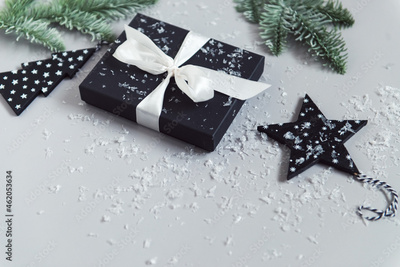 New year gift box white ribbon, snow and Christmas tree branches grey background
