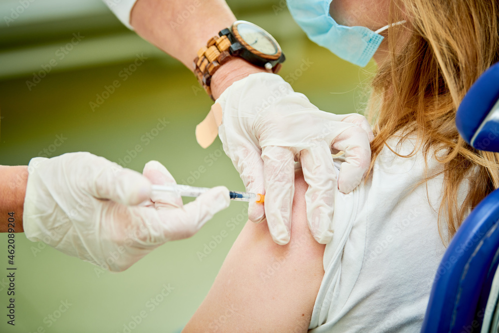Woman receiving covid vaccination at clinic. Coronavirus vaccine shot