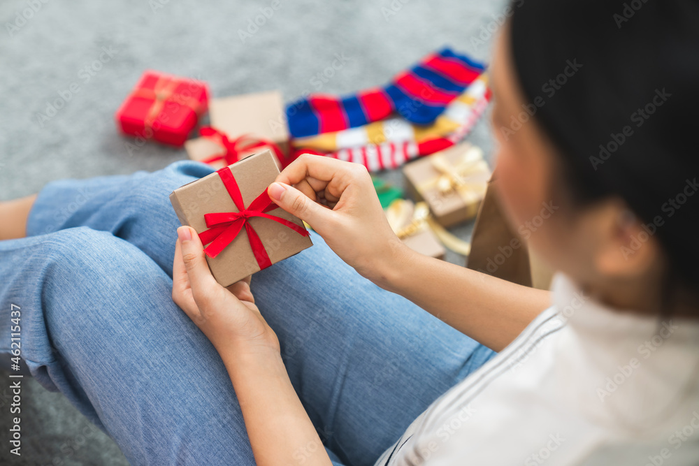 Young woman hands holding open gift box with red bow in the house, Concept of christmas, new year and birthday.