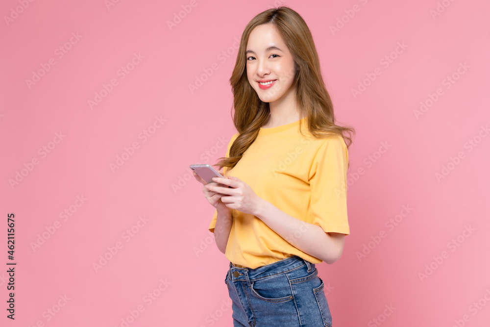 Studio shot of Beautiful Asian woman holding smartphone and smiling on light pink background