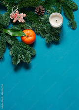 Christmas or New Year concept frame with festive winter holiday decoration with fresh tangerines. Copy space