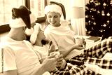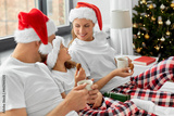 family, winter holidays and people concept - happy mother, father and little daughter with christmas gifts drinking coffee and eating cookies in bed at home