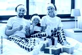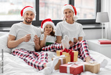 family, winter holidays and people concept - happy mother, father and little daughter with christmas gifts drinking coffee and eating coookies in bed at home