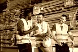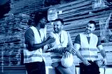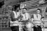 Happy manager and male workers talk and have fun on coffee break at distribution warehouse.