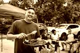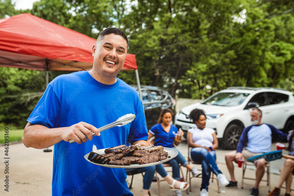 Man handing out burgers at a tailgate party