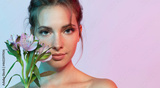 Beautiful girl with perfect clean skin and natural make-up looking at camera with flowers.