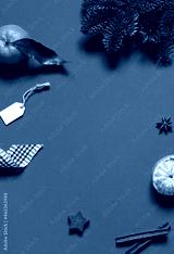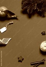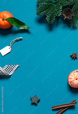 Christmas or New Year concept frame with festive winter holiday decoration and fresh tangerines. Copy space