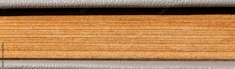 Old vintage yellowed book pages structure side view wide abstract rough background texture, banner, material closeup. Literature, reading, education, knowledge and learning simple backgrounds, nobody