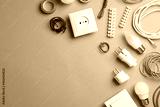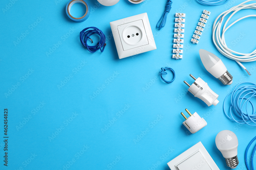 Flat lay composition with electrician's accessories on light blue background, space for text
