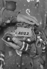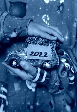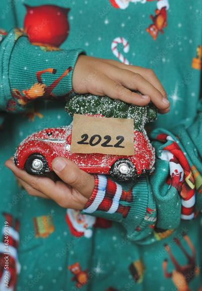 a child holds a New Year's car in his hands with the year 2022 and dreams of a new toy
