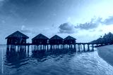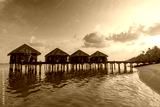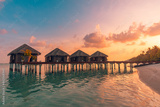 Sunset on Maldives island, luxury water villas resort hotel and wooden pier. Colorful sky and clouds and beach background for summer vacation holiday, traveling destination. Paradise sunset landscape