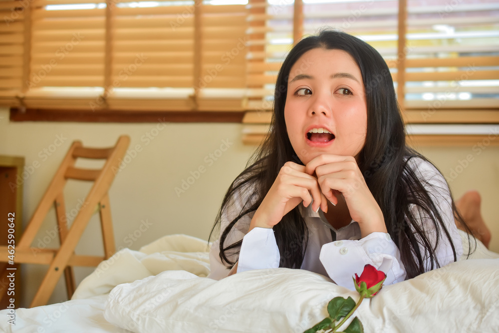 Lovely Happy women get up on bedroom morning