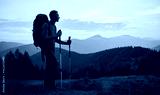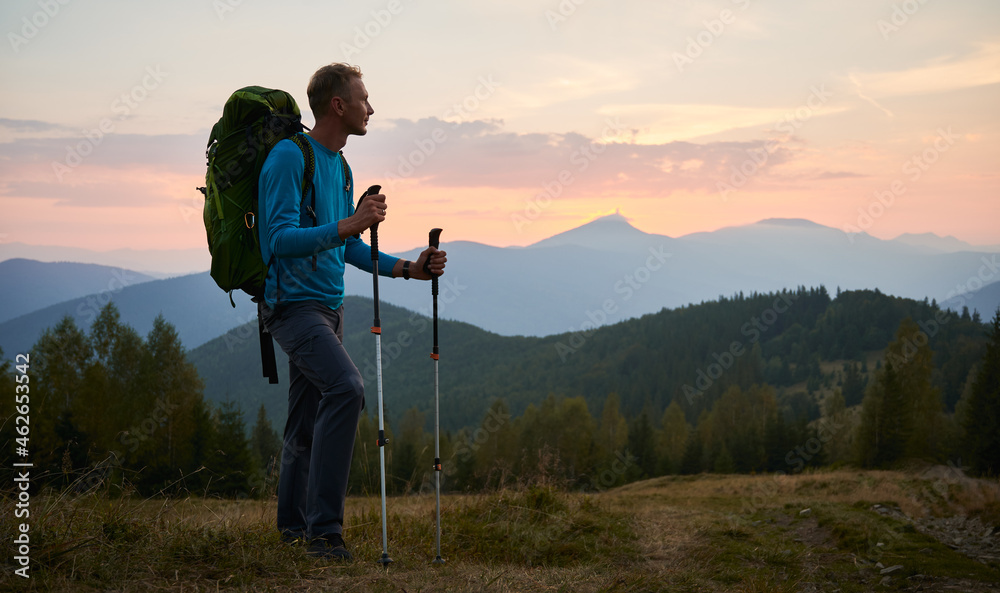 Man traveler against backdrop of mountain hills and pink cloudy evening sky at sunset. Hiker with trekking poles and touristic backpack standing on glade and admiring mountain fairytale landscape.
