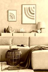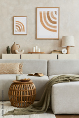 Creative composition of stylish living room interior with mock up poster frame, sofa, commode clay vases and stylish personal accessories. Pastel neutral colours. Template.