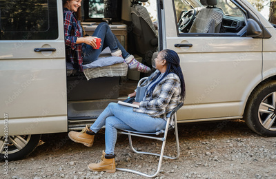 Multiracial women friends having fun camping inside camper van outdoor in the woods - Travel in nature concept - Focus on senior african woman face