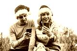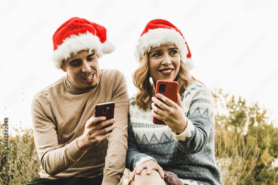 Hispanic couple in Santa hats are using smartphones, outdoors