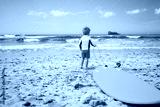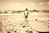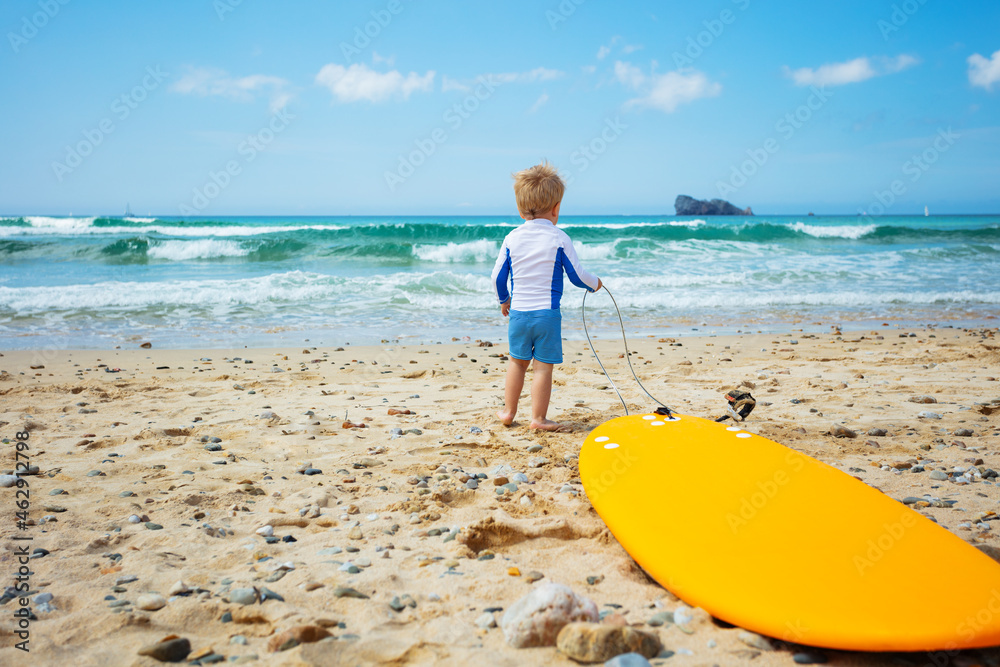 Little boy stand with surfboard looking sea waves