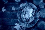 Roasted turkey garnished with cranberries on a rustic style table decorated with pumpkins, apples and autumn leaf. Thanksgiving Day. Flat lay. Top view