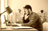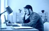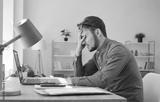 Tired worker having problem. Man makes dumb mistake or has difficulty with digital file. Side view of upset stressed young guy facepalming sitting at working desk with laptop computer in home office