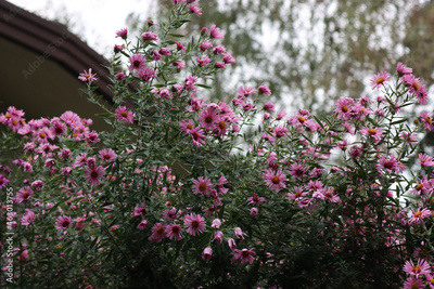 Bunch of Aster plants with many pink and purple flowers.. Aster Frikarti flowers on autumn in the garden