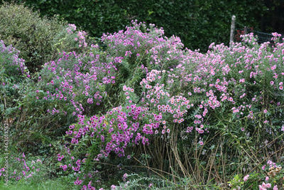 Bunch of Aster plants with many pink and purple flowers.. Aster Frikarti flowers on autumn in the garden